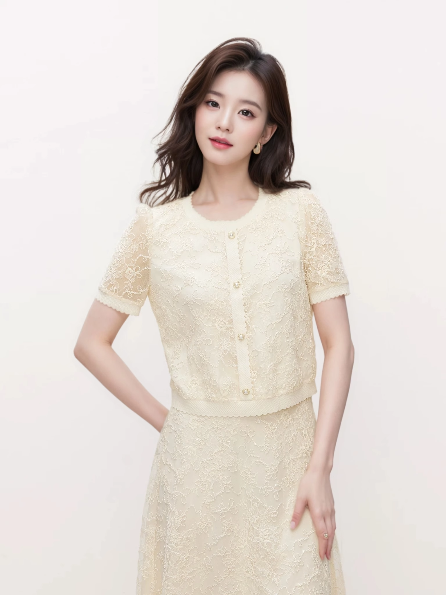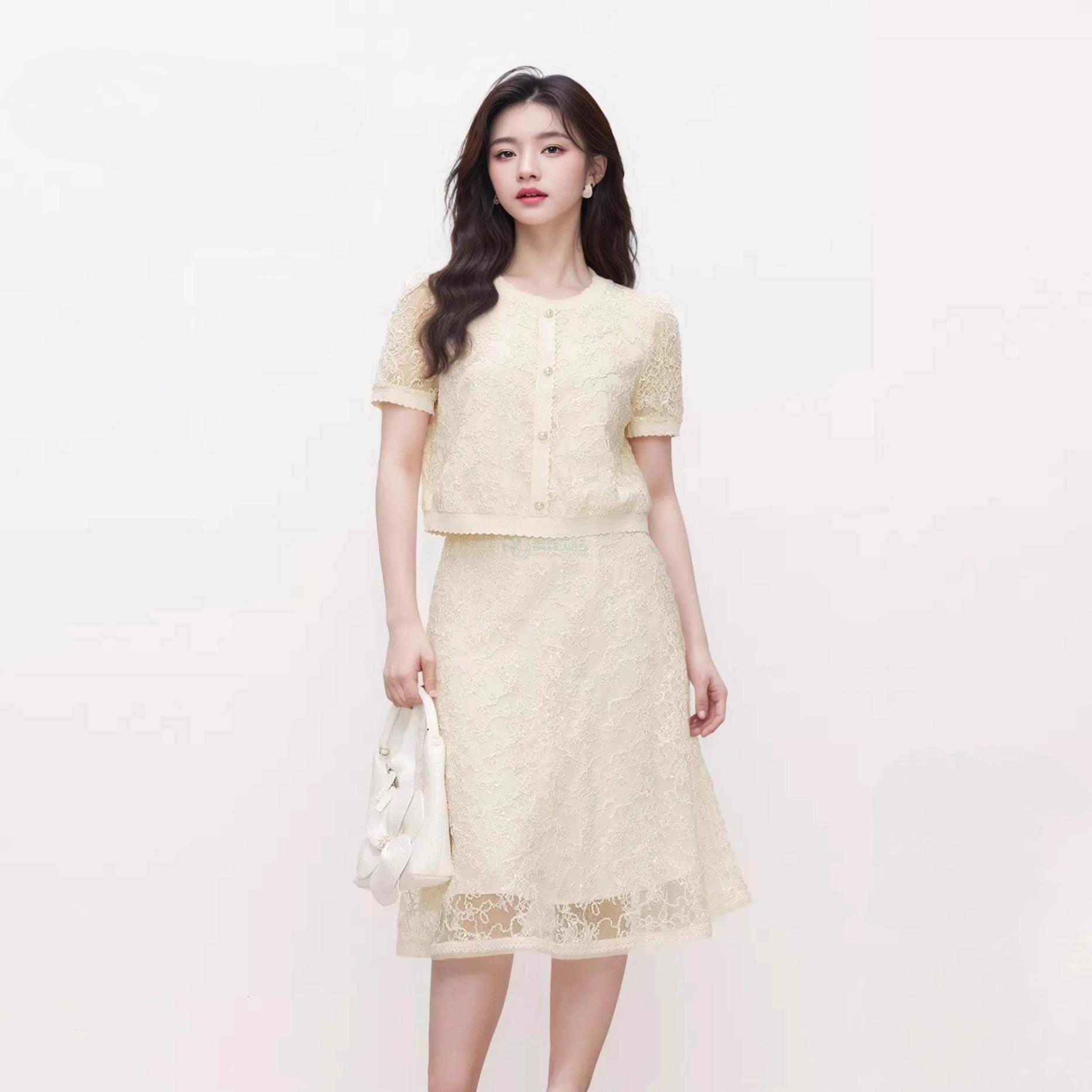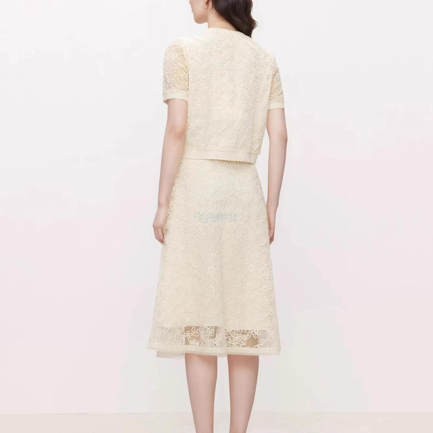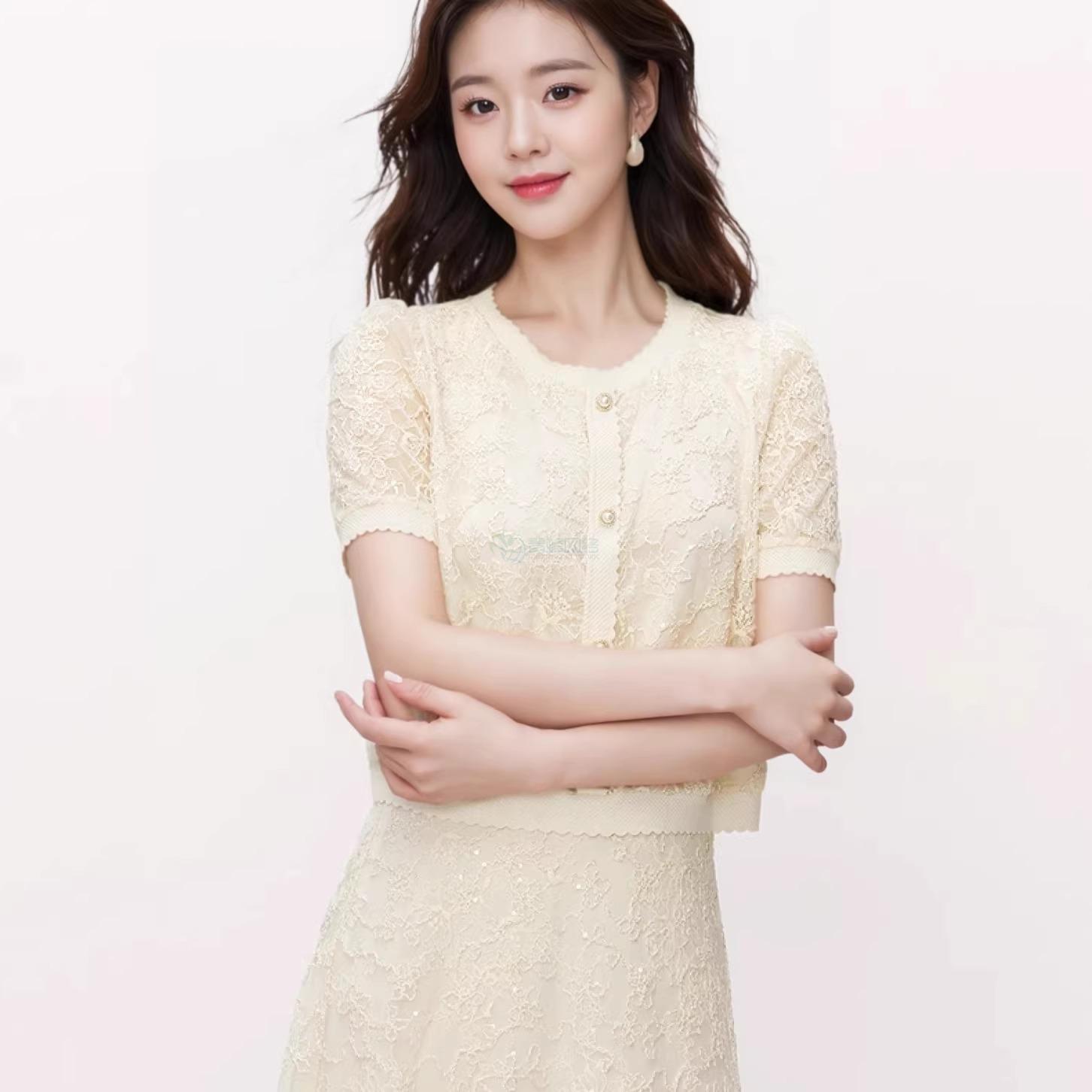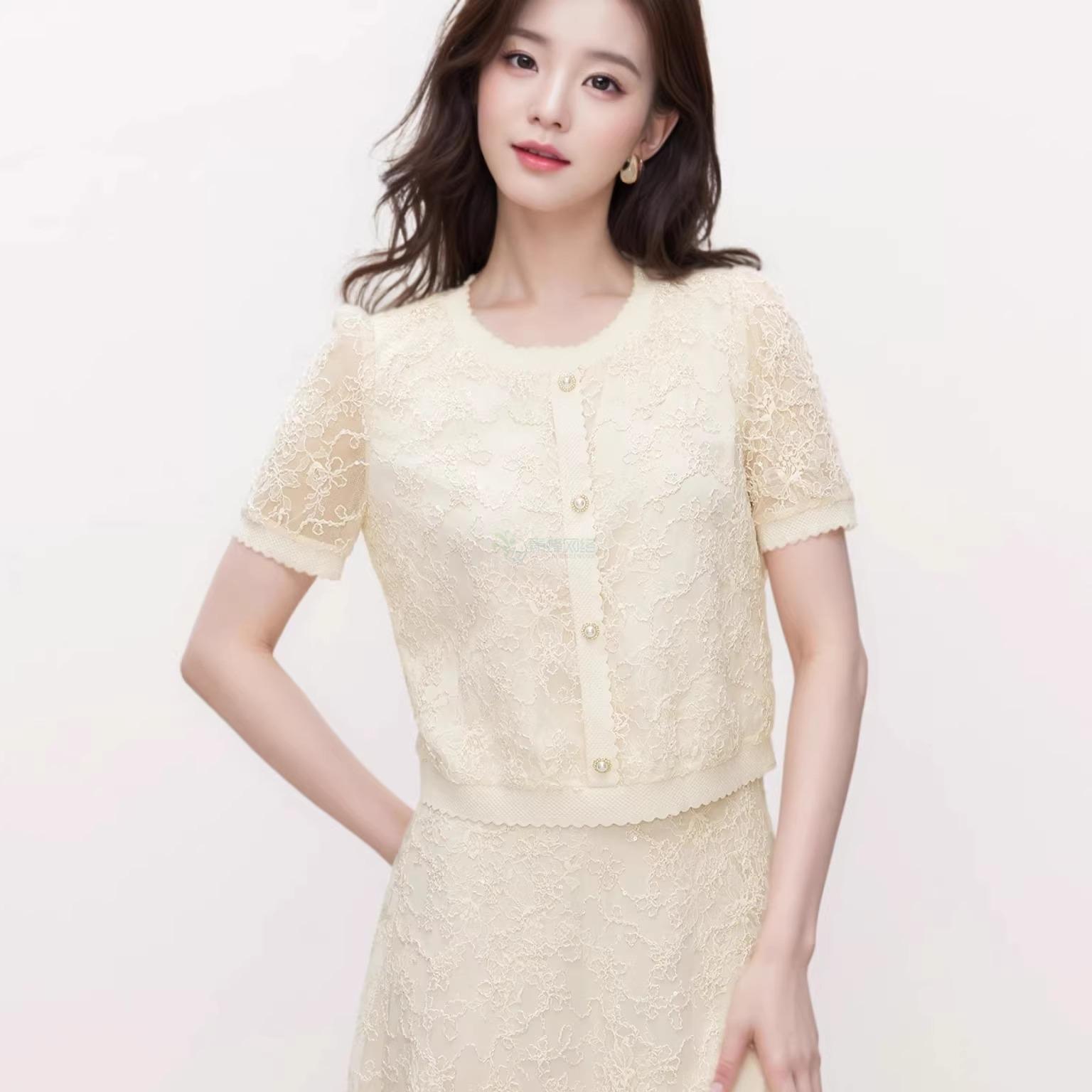 珂家2025年夏季新款优雅米色蕾丝小衫女短袖气质设计感上衣