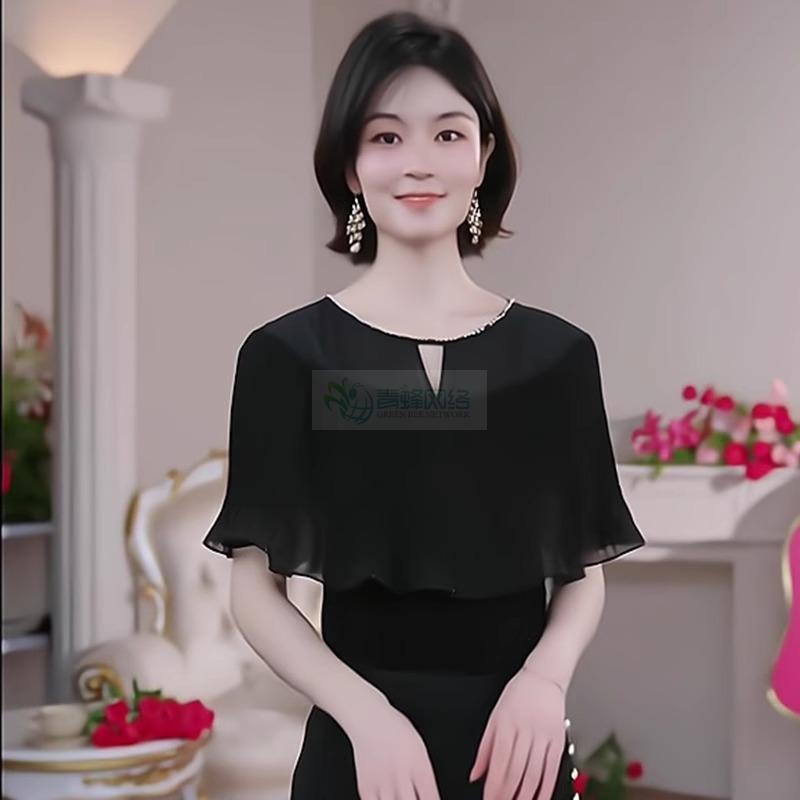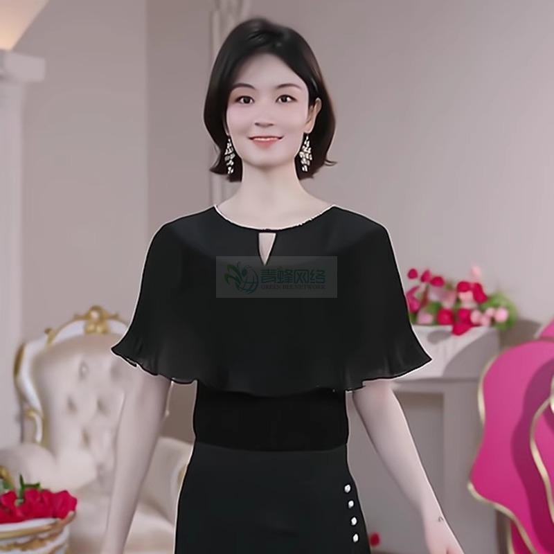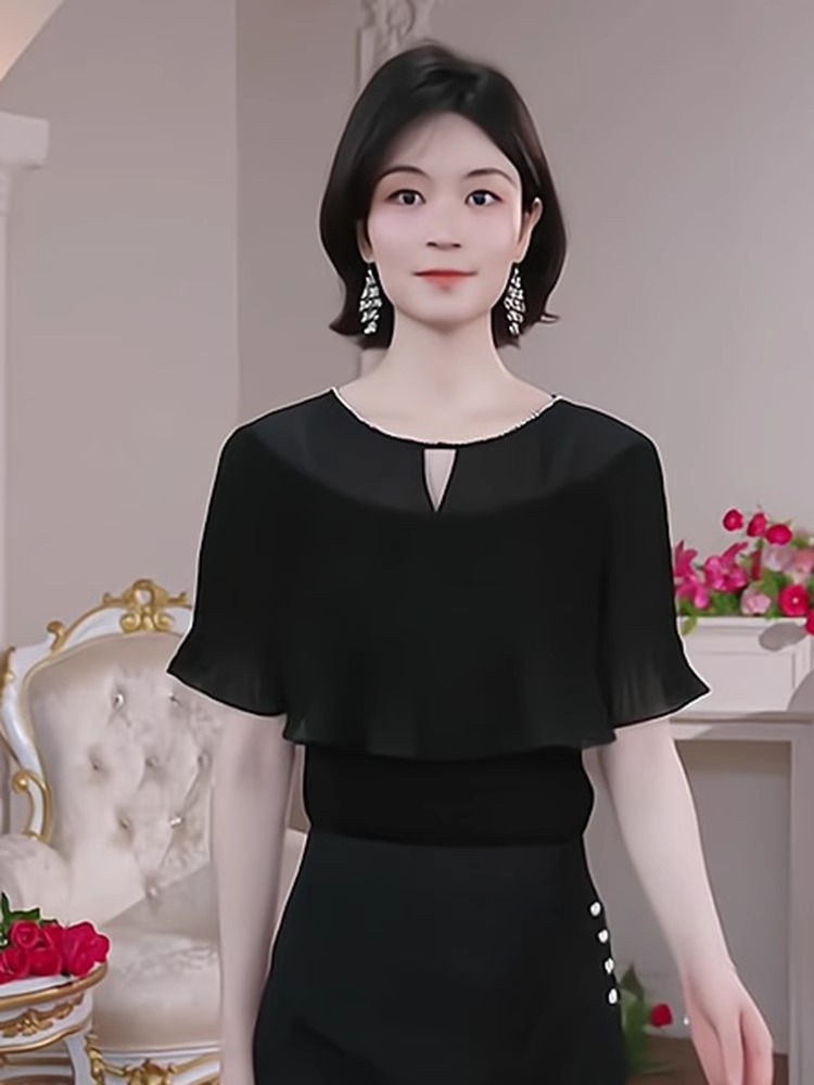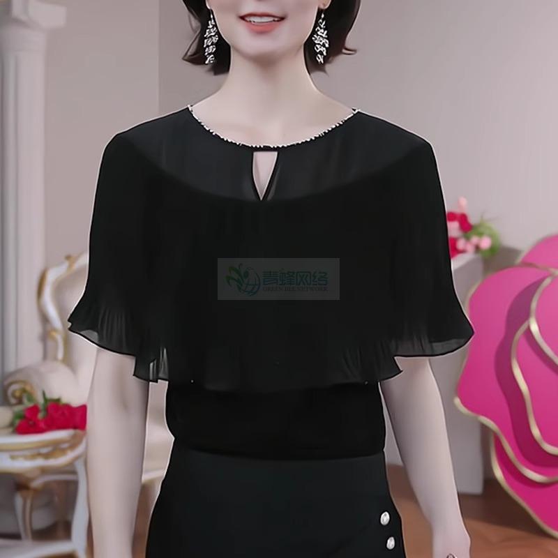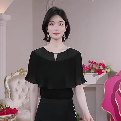 轻奢优雅黑色短袖针织衫女装2025夏季新款荷叶边气质镂空薄款上衣